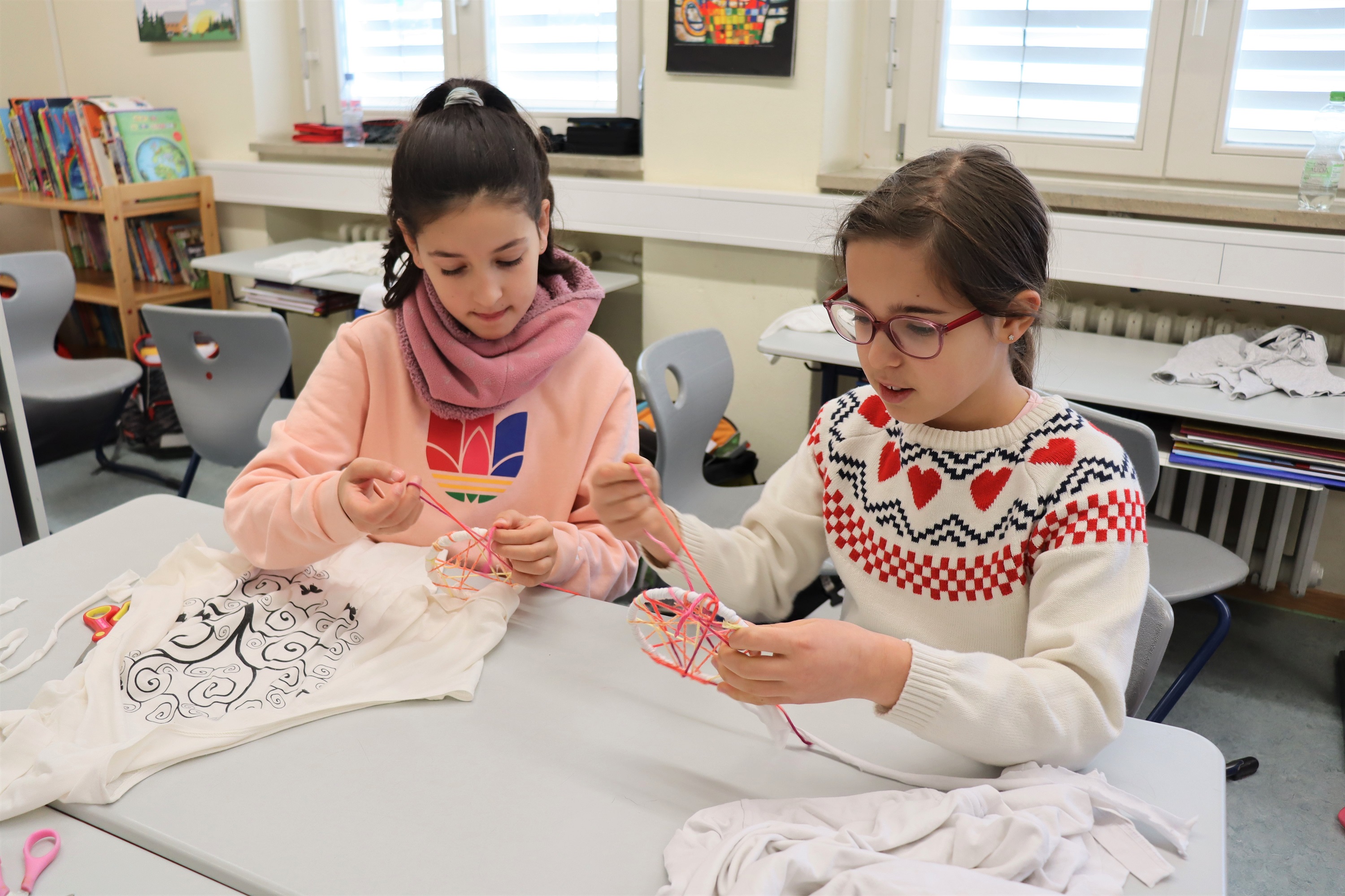 Gemeinsam lernten die Kinder die textile Wertschöpfungskette kennen und konnten herausfinden, wie in einem langwierigem Prozess aus einer Baumwollfrucht ein T-Shirt hergestellt wird und welche Ressourcen dafür verbraucht werden. Gemeinsam suchten wir Möglichkeiten, was mit alten ausrangierten T-Shirts gemacht werden kann. Nach einem kurzen theoretischem Einstieg wurden die mitgebrachten T-Shirts in lange Bahnen geschnitten und für die Herstellung eines Traumfängers genutzt.