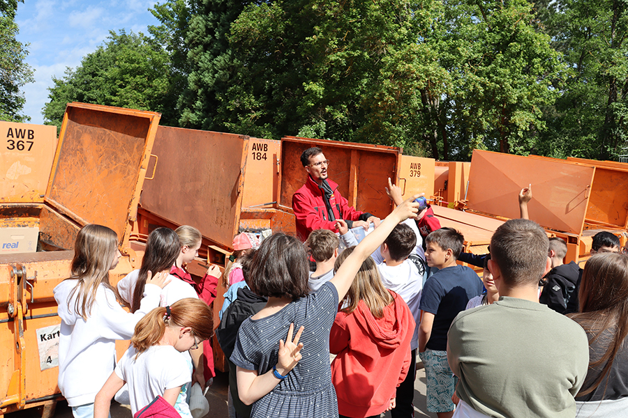 Auf Anfrage erhalten Kindergärten und Schulen eine kostenlose Führung auf einem unserer 31 Wertstoffhöfe oder auf unserem Müllfriedhof. Vor Ort erleben die Kinder, wie Wertstoffe richtig sortiert werden und welchen hohen Stellenwert die Abfallvermeidung einnimmt.