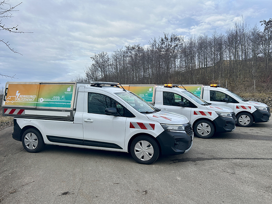Der Abfallwirtschaftsbetrieb Böblingen nimmt drei weitere vollelektrische Fahrzeuge für die Reinigung von Containerstandorten zur Sammlung von Glas, Dosen und Alttextilien in Betrieb. Die Flotte von insgesamt vier Reinigungsfahrzeugen wurde damit komplett auf vollelektrische Antriebe umgestellt. Die Fahrzeuge fahren emissionsfrei und leise durch alle 26 Kommunen des Landkreises Böblingen. Sie sind für die Reinigung und Pflege der ca. 350 Standorte konzipiert und haben dazu einen Spezialaufbau mit Abkippvorrichtung zur besseren Befüllung und Entladung des illegal abgelagerten Mülls. Die Müllwerker müssen täglich Wilden Müll vor allem an den Containerstandorten im Kreis Böblingen, aber auch außerorts, wo Kommunen nicht zuständig sind, entfernen und fachgerecht entsorgen.