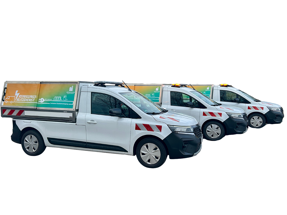 Unsere Fahrleistung beträgt fast zwei Millionen Kilometer pro Jahr. Um die damit einhergehenden Emissionen zu verringern, wurden 2025 ein weiterer vollelektrischer Dienstwagen sowie drei Standortreinigungsfahrzeuge mit Kipper-Pritsche, die ebenfalls zu 100% mit Strom fahren, angeschafft. Die drei Transporter zählen zu einer Flotte von insgesamt vier Fahrzeugen, die beim Einsammeln illegaler Müllablagerungen und der Reinigung der Containerstandorte im Landkreis eingesetzt werden und nun komplett vollelektrisch betrieben unterwegs sind - leise und frei von CO2-Emissionen.