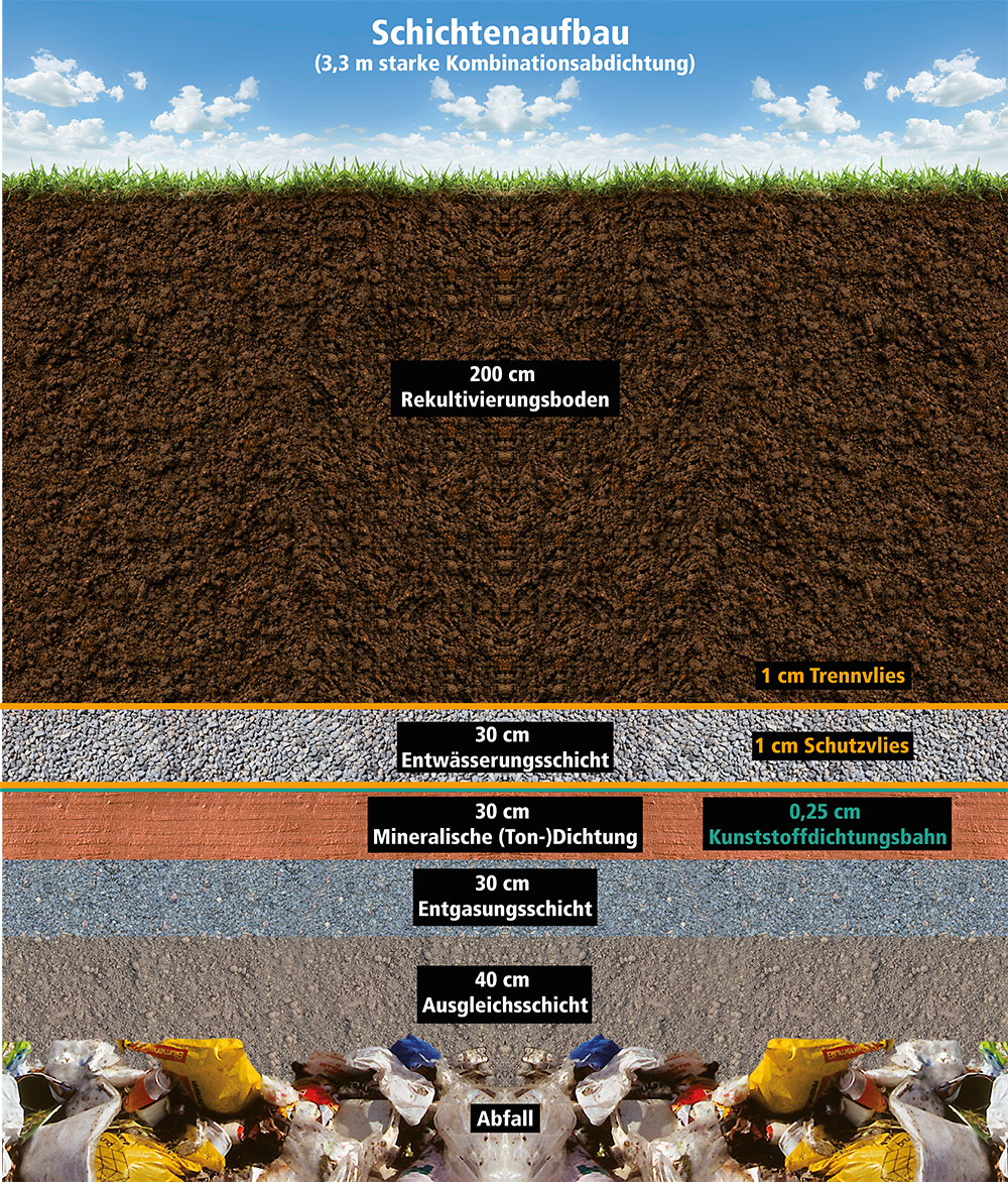 Die Oberflächenabdichtung einer Deponie ist insgesamt über drei Meter hoch. Sie besteht aus Entgasungs- und Entwässerungsschichten, einer mineralischer Dichtung, einer Kunststoffdichtungsbahn und Vliesen. Darüber liegt ein zwei Meter hoher Rekultivierungsboden. Das Deponiesickerwasser wird eingefasst und in eine Kläranlage abgeleitet. Ein Deponiekörper gast auch nach einer Oberflächenabdichtung weiter aus. Allerdings sinken die Gasmenge und der Methangehalt stetig ab. Das mittlerweile methanschwache Schwachgas behandeln wir thermisch zur Vermeidung von klimaschädlichen Emissionen. Betrachtet man die Schwachgasbehandlungsanlagen aller drei Deponien zusammen, ergibt sich eine Summe von ca. 7.800 t an eingespartem CO₂ pro Jahr.
